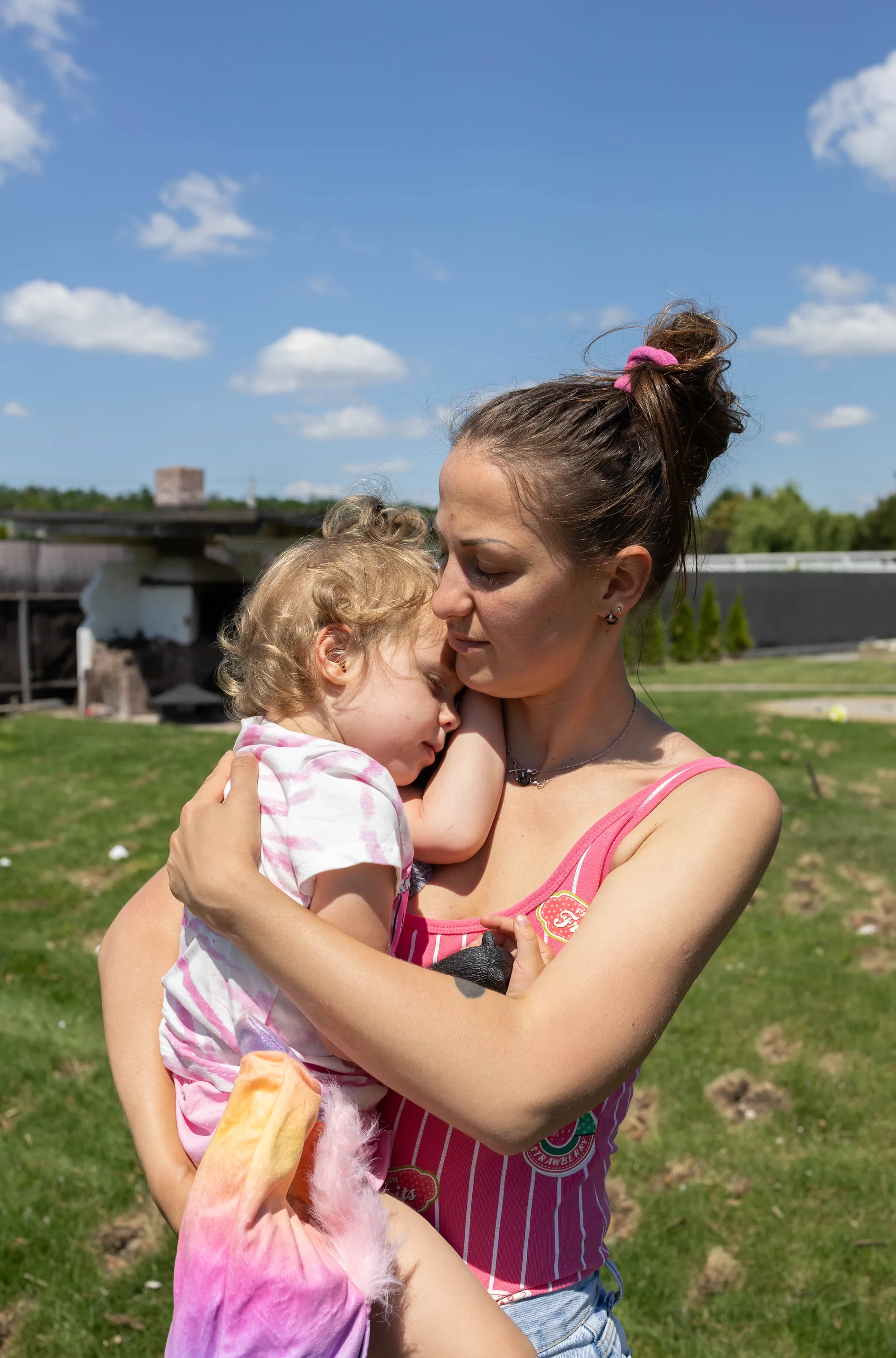 Natalia Lypko, 31 tuổi, và con gái Leia, 2 tuổi, gần những gì còn sót lại của ngôi nhà của họ, bị phá hủy trong cuộc tấn công của Nga vào tháng 6, làng Hora, Tỉnh Kyiv, Ukraine, vào ngày 3 tháng 7 năm 2025. (Anna Donets/The Kyiv Independent)